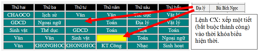 2.3. Lệnh xếp bằng được 1 tiết vào ô lưới của một thời khóa biểu lớp hoặc giáo viên (gọi là lệnh CX).