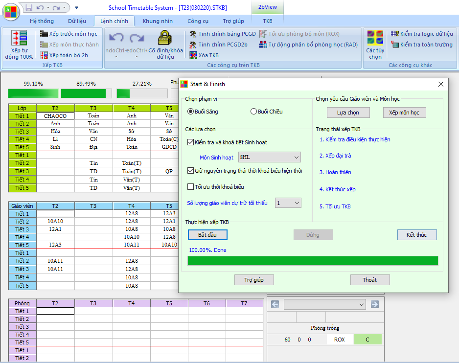 Lệnh xếp tự động toàn (100%) thời khóa biểu được phát triển áp dụng cho tất cả các mô hình dữ liệu thời khóa biểu bao gồm cả phòng bộ môn và đa năng. Phần mềm sẽ tự động phân tích bộ dữ liệu hiện có và kiểm tra xem có thể xếp được toàn bộ công việc hay không. Nếu không có lỗi logic phần mềm sẽ tiến hành xếp tự động toan bộ thời khóa biểu nhà trường trong thời gian một vài phút.